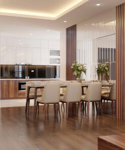 Khu vực bàn ăn với bộ bàn ghế gam màu trung tính tạo cảm giác sạch sẽ để tăng thêm phần ngon miệng cho các bữa ăn của gia đình. Bàn ghế được bố trí tại khu vực hợp lý, thoáng đãng tránh hiện tượng va quệt khi di chuyển. Từ vị trí bàn ăn, gia chủ có thể bao quát phòng khách và gần như toàn bộ ngôi nhà. Đây là vị trí đắc địa để thưởng thức bữa cơm gia đình trọn vẹn với toàn bộ thành viên của gia đình.
