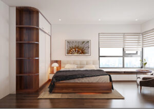 Phòng ngủ lớn được thiết kế là nơi nghỉ ngơi của vợ chồng. Phòng đảm bảo sự riêng tư, thoải mái, thư giãn và ánh sáng thân thiện với sức khỏe. Thiết kế cửa sổ lớn hỗ trợ đón nhiều nắng và mang lại năng lượng tích cực mỗi sớm mai khi thức dậy. Phòng được trang trí bằng các vật dụng như tranh tường, kệ sách, bình hoa thêm phần sinh động. Thiết kế nội thất phòng ngủ khá cơ bản với giường, tủ quần áo, bàn làm việc, tủ đầu giường… Tuy nhiên, phòng này dược đầu tư về trải nghiệm sử dụng (giường lớn, đệm cao su non, chăn ga gối cotton giữ và cách nhiệt tốt, khu vực làm việc hướng cửa sổ thư giãn..). Gam màu chủ động trong loại phòng này là gam nâu ấm có độ trầm vừa phải. Đi kèm với đó là các mảng màu sáng như trắng – kem be giúp cơi nới không gian và làm nổi bật các chi tiết nội thất khác.