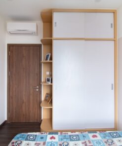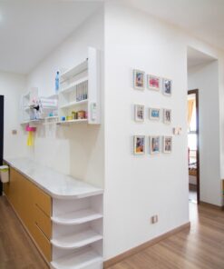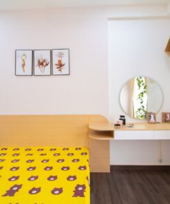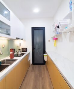 Bếp được thi công tại vị trí khá riêng tư và yên tĩnh giúp chị em tập trung nấu những bữa ăn ngon cho gia đình. Khu bếp có cửa mở thông ra ngoài đóng góp như một hệ thống hút mùi tự nhiên. Thiết kế tủ bếp chữ I tận dụng không gian, thuận tiện cho việc di chuyển và sử dụng toàn bộ khu bếp..