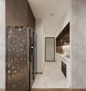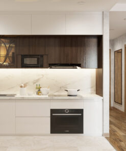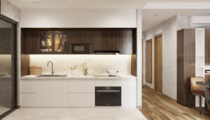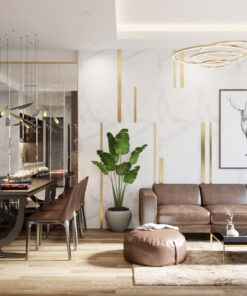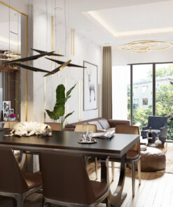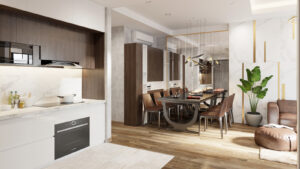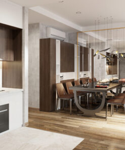 Các khu vực khác như bếp, phòng khách, khu vệ sinh… được Nội thất Xbox nghiên cứu tỉ mỉ và bố trí nội thất hợp lý phù hợp với địa hình thực tế. Bạn khó có thể tìm được góc chết nào trong căn hộ của mình với các thiết kế từ Nội thất Xbox. Các vật liệu phổ biến như gỗ MDF, gỗ tự nhiên, kính cường lực, vải cotton, da… được xử lý tinh tế nâng tầm phong cách sống cho không gian. Bếp được thiết kế dạng chữ I tiết kiệm diện tích với đầy đủ tiện nghi như máy hút mùi, mát rửa chén bát, tủ bát, bếp điện, lò nướng, tủ lạnh 2 cánh… Khu vực phòng khách sử dụng sofa nâu gỗ đồng điệu cùng bộ bàn ăn từ gỗ sang trọng đặt làm cách điệu. Đèn thả sáng tạo được trang trí cho khu vực bàn ăn chắc chắn sẽ là điểm nhấn khó quên cho bữa ăn của cả gia đình hoặc các dịp thết đãi bạn bè.