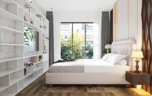 Thiết kế phòng ngủ kiểu mở với cửa sổ lớn đón được nhiều ánh sáng giúp không gian trông rộng rãi hơn. Phòng được thiết kế theo hơi hướng pha trộn giữa nét đẹp hiện đại và vẻ đẹp cổ điển. Giường lớn và tủ quần áo được bố trí hợp lý giúp người dùng thuận tiện trong sinh hoạt hàng ngày. Đèn trang trí và hệ thống đèn được tích hợp bổ sung nguồn sáng thân thiện với sức khỏe gia chủ và người thân.