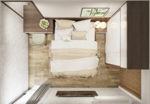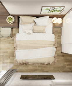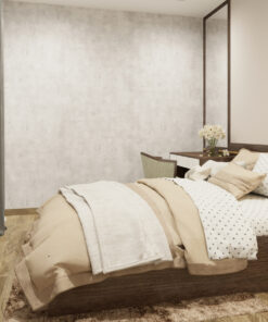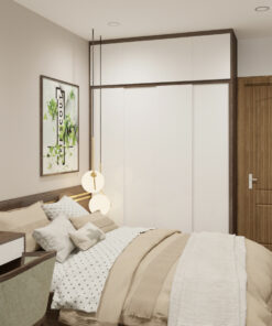 Phòng ngủ được thiết kế dành cho cặp vợ chồng gắn bó keo sơn cùng tận hưởng những giây phút thư giãn riêng tư sau ngày dài làm việc mệt mỏi. Không gian được bố trí nội thất hợp lý đảm bảo phục vụ tót các nhu cầu sinh hoạt hàng ngày của gia chủ. Thẩm mỹ được chú trọng về sự hài hòa, tinh tế kết hợp với nét trang nhã Á đông gần gũi với văn hóa gia đình người Việt. Tuy diện tích căn phòng không lớn, nhưng vẫn tạo cảm giác không gian thoáng đãng, gọn gàng, sạch sẽ. Tủ quần áo, bàn gương trang điểm, sàn… đều sử dụng gỗ MDF được xử lý chống mối mọt, tăng độ bền với lớp màu sáng cơi nới không gian.