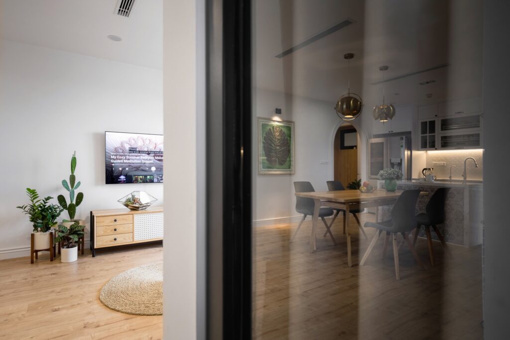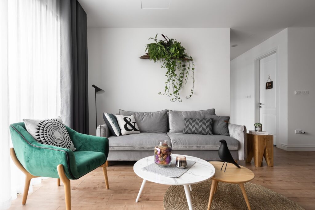 Đặc trưng của phong cách này chính là sử dụng nội thất đơn giản, trong không gian căn hộ này phòng khách được sử dụng ghế sofa hình chữ I đơn giản kết hợp bàn tròn. Tivi được đặt trên kệ trang trí nhỏ. Đặc biệt màu sắc sử dụng cho căn hộ là những tông màu nhẹ nhàng mang lại cảm giác rộng rãi.