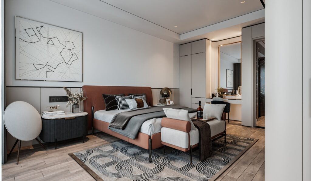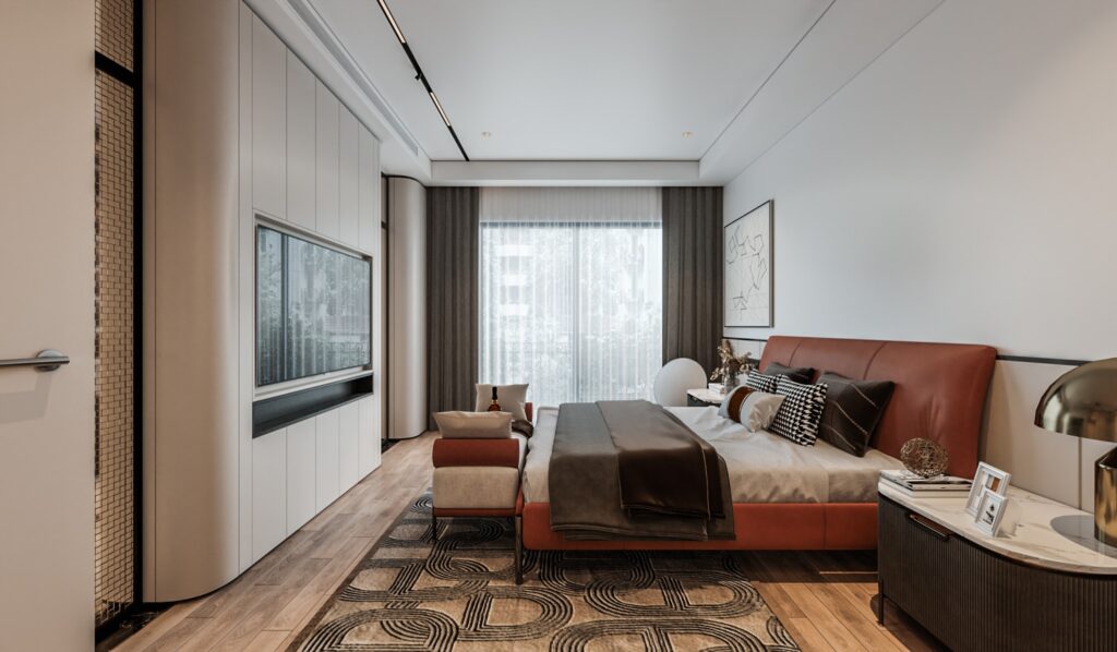Chiếc giường da cao cấp màu đỏ cam cũng như đôn ở cuối giường ngủ là điểm nhấn cho căn phòng. Còn gì hài hòa hơn khi trong một căn phòng với các màu sắc trung tính, chiếc giường màu sắc nổi bật nhưng ấm áp khiến tổng thể căn phòng thêm phần hút mắ.