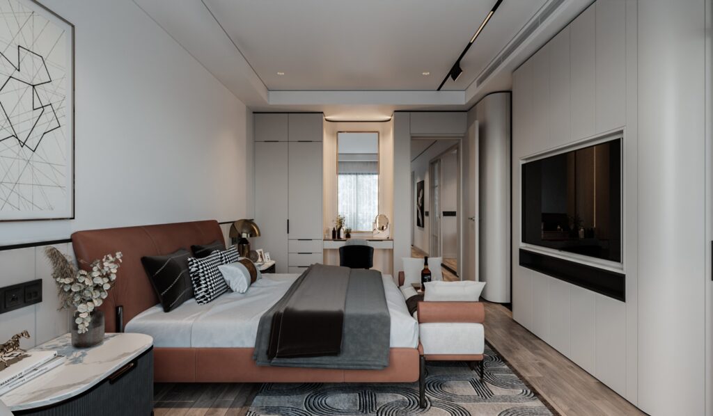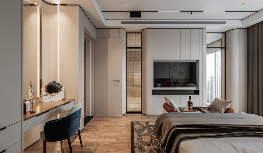 Không gian phòng ngủ là sự pha trộn giữa sự đơn giản với những đường nét cầu kỳ, tỷ m. Màu nâu trầm của gỗ hòa quện cùng vật liệu kính màu trà của tủ áo. Ánh vàng của chất liệu PVD cộng hưởng cùng ánh đèn trang trí…. Tất cả cùng tạo lên một bức trang ấm ấp, sang trọng, hiện đại và tinh tế. Thể hiện cái gu thời thượng, đẳng cấp của nhân căn phòng.