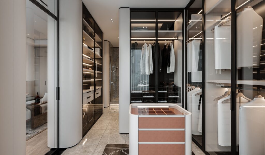 Yêu thích các món phụ kiện trang sức, một chiếc tủ mặt kính trong suốt với màu sắc nổi bật chắc chắn không thể thiếu trong walking closet của một tín đồ đam mê thời trang. Chất liệu pha da cũng khiến chiếc tủ này thêm phần sang xịn.